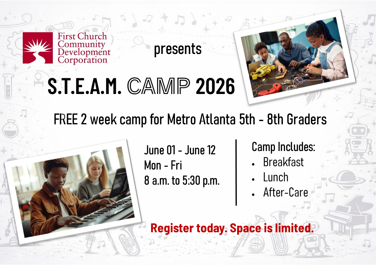 The 2026 STEAM Camp is a joyful partnership program powered by First Congregational Church, First Church Community Development Corp, CHOICES, STEAMsport, Inc., and the Urban Youth Harp Ensemble. Together, we’re bringing Atlanta middle school students an unforgettable two‑week adventure where music, technology, art, and innovation come alive.